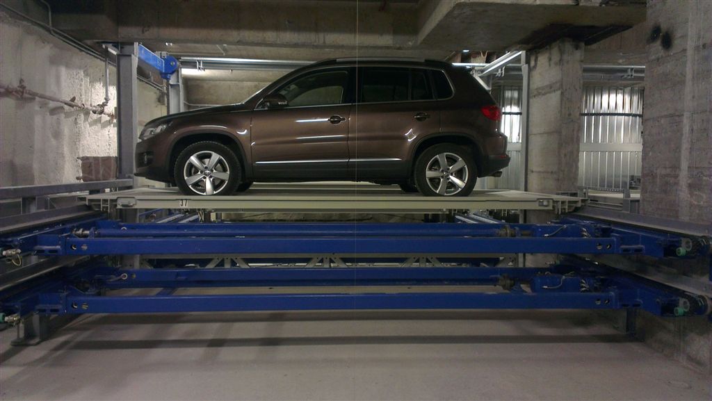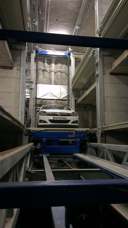 El sistema cuenta con un ascensor lateral que es el encargado de bajar al coche al bajo rasante y de girar al vehículo 180º para dejarlo en posición de salido. Una vez en el sótano un dispositivo de traslación horizontal mueve al vehículo hacia el robot de distribución que es el encargado de ubicarlo en la posición de aparcamiento designada por el sistema, como también el proceso inverso, de retirada de los vehículos. El sistema cuenta con capacidad para 40 vehículos altos, hasta 1,95 mts. de altura. En este aparcamiento se ha instalado un almacén de pallets vacíos y un ascensor lateral con intercambiador de pallets, dispositivos innovadores de Stolzer para optimizar los tiempos.